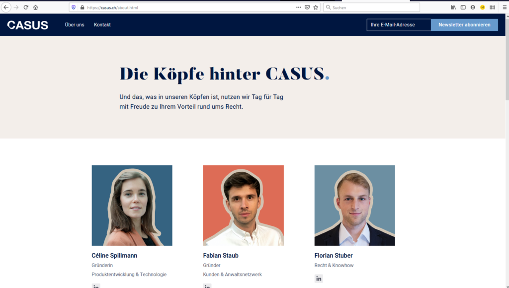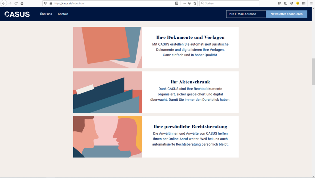 Casus ist ein junges Legaltech-Startup aus Zürich, das KMU eine Art digitale Rechtsabteilung bietet. Die Kunden können online Verträge erstellen, ihre Dokumente verwalten und und sich direkt durch Rechtsanwälte aus dem Netzwerk von Casus beraten lassen. Dieses komplexe digitale Produkt wollte Casus auf einer Webseite «verständlich und frisch» präsentieren. Oha! Und noch mehr Oha!, als ich den von Casus selbst geschrieben Textvorschlag gelesen hatte: Das war verständlich. Das war frisch. Das war richtig gut.